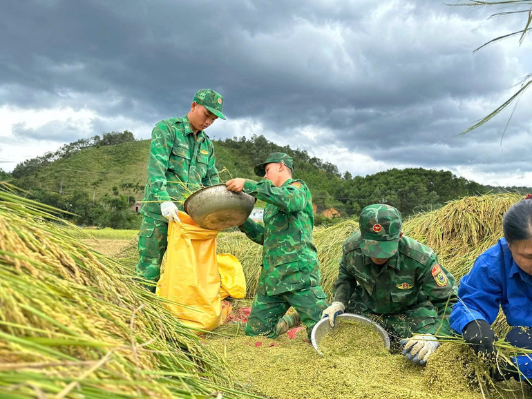 | Sáng 7/9 đoàn viên thanh niên Chi đoàn Đồn Biên phòng cửa khẩu A Đớt tổ chức cho 20 cán bộ, chiến sĩ xuống đồng gặt lúa Hè-Thu, giúp dân "chạy bão số 3" cho các hộ dân ở thôn A Tin, xã Lâm Đớt, huyện A Lưới, tỉnh Thừa Thiên Huế. |