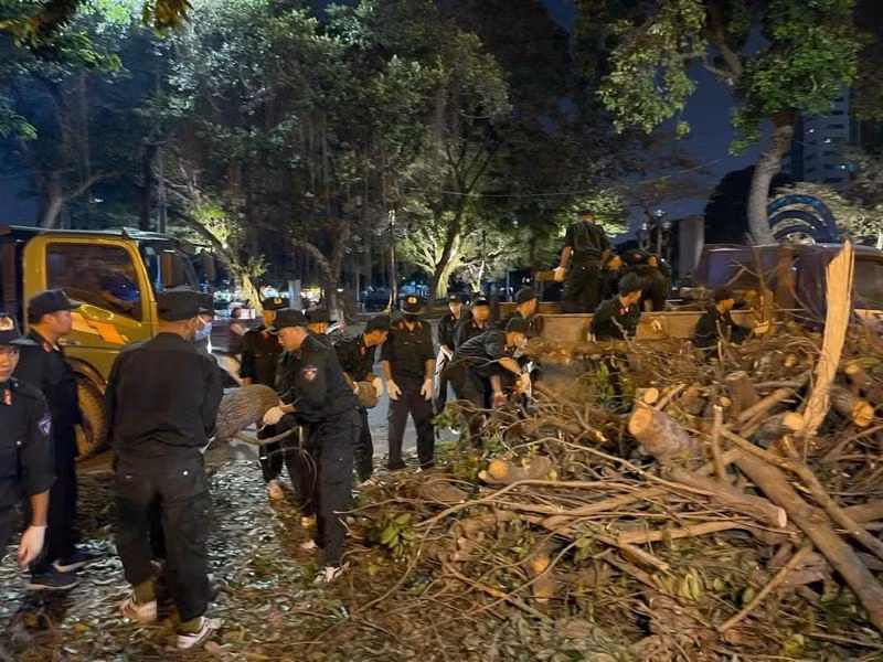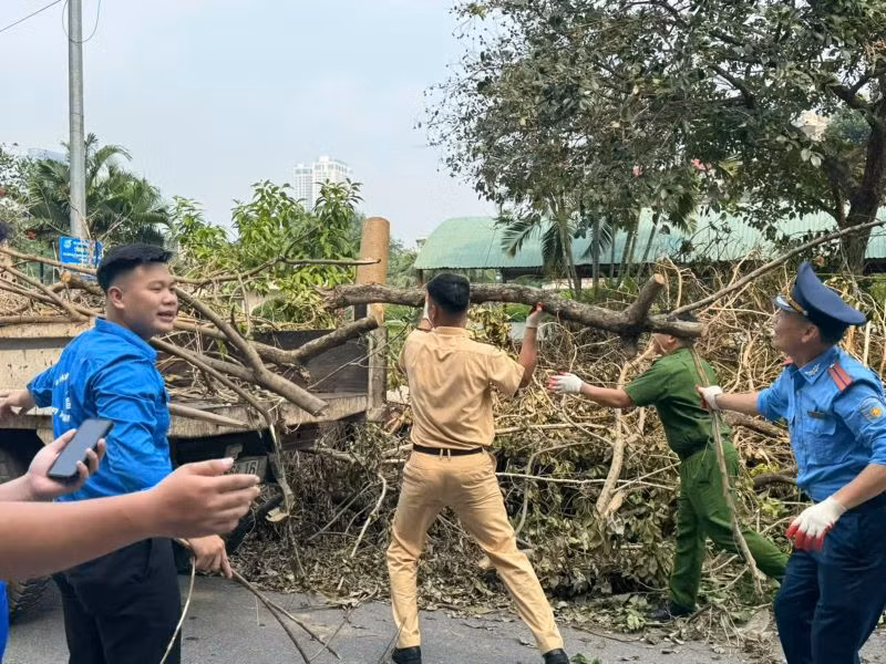 Trên nhiều tuyến đường cây bị đổ, công nhân và lực lượng chức năng tạm tập kết các cây gãy đổ trên vỉa hè, chưa thể dọn dẹp được hết. Tại một số khu vực cây đổ, nhiều lòng đường vẫn ngổn ngang khiến giao thông bị ảnh hưởng.