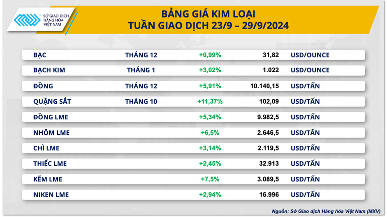 Đối với kim loại quý, giá bạc nối dài đà tăng sang tuần thứ ba liên tiếp khi tăng 0,99% lên 31,81 USD/ounce. Giá bạch kim cũng chinh phục lại vùng giá 1.000 USD/ounce khi tăng 3,02%, chốt tuần lại mức 1.022 USD/ounce.