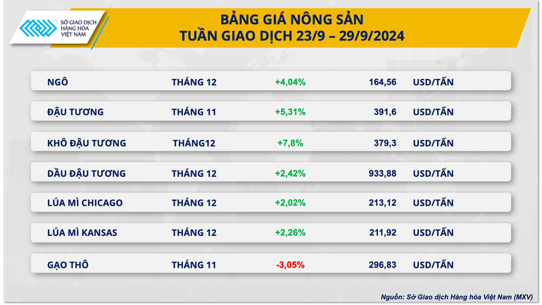Sắc xanh bao phủ thị trường nông sản trong tuần giao dịch cuối tháng, trong đó, nhóm ngũ cốc đóng vai trò dẫn dắt đà tăng của cả nhóm. Giá ngô hợp đồng tháng 12 ghi nhận mức tăng hơn 4%, trong bối cảnh nguồn cung ở khu vực Nam Mỹ bị đe dọa bởi thời tiết.