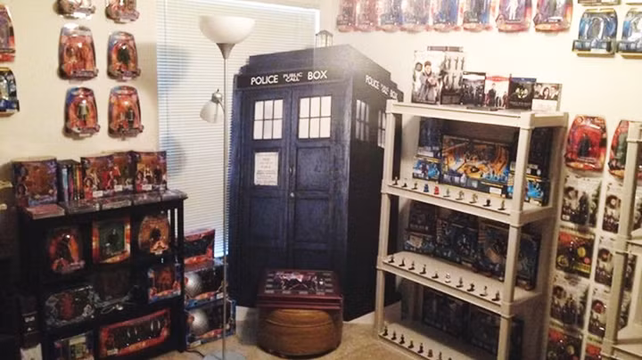 CNN đưa tin, ông Lee Thompson và người con trai sống tại Ontario, (Canada) đang sở hữu bộ sưu tập 7.507 món đồ lưu niệm (trong ảnh) liên quan nhân vật "Doctor Who" trong loạt phim khoa học viễn tưởng nổi tiếng của Anh. Ông cho biết, đã thu thập được hơn 21.000 món đồ cùng chủ đề, trong đó có hơn 7.500 loại khác nhau và mở cửa một bảo tàng Doctor Who cho khách tham quan.