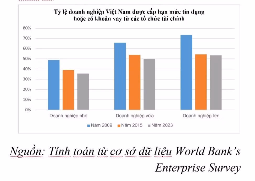 Tương tự, với nhóm doanh nghiệp, tình hình sở hữu tài khoản kém hơn qua thời gian ở cả ba nhóm quy mô: nhỏ, vừa và lớn; khoảng cách về tiếp cận dịch vụ tài chính doãng rộng ra theo hướng bất lợi cho doanh nghiệp nhỏ. Đối với nhóm doanh nghiệp “siêu nhỏ”, hộ kinh doanh (khoảng 5-6 triệu đồng/tháng) khả năng tiếp cận tín dụng chính thức cũng rất hạn chế.