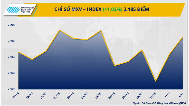 Theo Sở Giao dịch Hàng hóa Việt Nam (MXV), sắc xanh áp đảo trên bảng giá hàng hóa nguyên liệu thế giới trong ngày giao dịch đầu tuần (4/11) kéo chỉ số MXV-Index tăng 1,02% lên 2.185 điểm.
