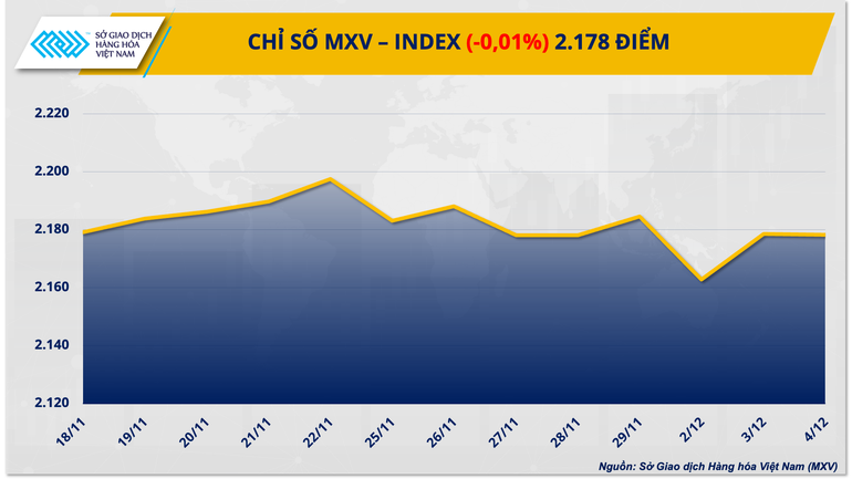 Sở Giao dịch Hàng hóa Việt Nam (MXV) cho biết, thị trường hàng hóa nguyên liệu thế giới diễn biến trái chiều trong phiên giao dịch ngày hôm qua (4/12). Đóng cửa, chỉ số MXV-Index gần như không thay đổi, vẫn dừng ở mức 2.178 điểm.