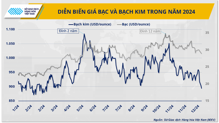 Nhờ sự cộng hưởng của hai yếu tố này, kim loại quý đã đón nhận làn sóng tăng giá mạnh mẽ và chứng kiến những mức tăng ấn tượng. Theo ghi nhận của Sở Giao dịch Hàng hóa Việt Nam (MXV), giá bạc kết thúc năm ở mức 28,91 USD/ounce, tương đương tăng hơn 20% so với đầu năm, mức tăng này vượt trội hơn nhiều so với cổ phiếu, trái phiếu và hàng hóa tại các thị trường mới nổi. Đáng chú ý, vào gần cuối tháng 10, lần đầu tiên mặt hàng này chạm tới vùng giá 35 USD/ounce sau 12 năm. Đối với bạch kim, giá mặt hàng này có hiệu suất tăng kém hơn nhưng mặt hàng này đã chứng kiến sự phục hồi tích cực sau khi giảm tới gần 10% trong năm 2023.