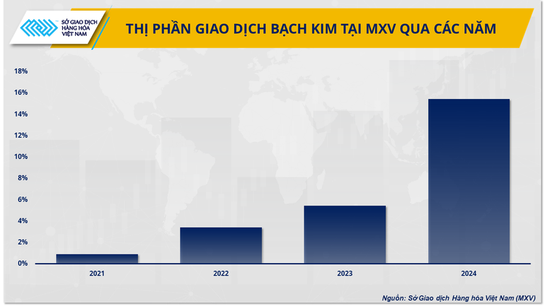 Đáng chú ý, bạch kim đã nỗ lực vươn lên trở thành mặt hàng được giao dịch nhiều nhất tại MXV trong năm 2024, chiếm tỷ trọng hơn 15%. Như vậy, chỉ trong vòng ba năm, thị phần giao dịch bạch kim tại MXV đã bứt phá tăng mạnh. Trước đó, vào năm 2022, bạch kim chỉ nằm ở vị trí thứ 9 trong bảng xếp hạng 10 mặt hàng được giao dịch nhiều nhất, với tỷ trọng dừng ở mức 3,4%. Sang năm 2023, tỷ lệ này đã tăng lên khoảng 5,4% và bạch kim đã vươn lên vị trí thứ 6.