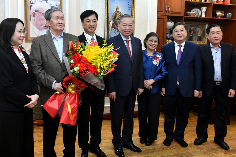 Tổng Bí thư Tô Lâm thăm hỏi, chúc Tết đồng chí Đinh Thế Huynh, nguyên Ủy viên Bộ Chính trị, nguyên Thường trực Ban Bí thư. Ảnh: Đăng Khoa