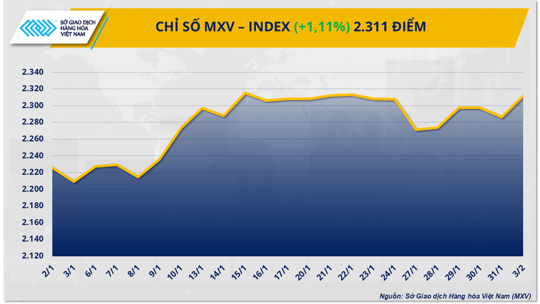 Theo MXV, thị trường hàng hóa nguyên liệu thế giới biến động mạnh trong phiên giao dịch đầu tuần (3/2).