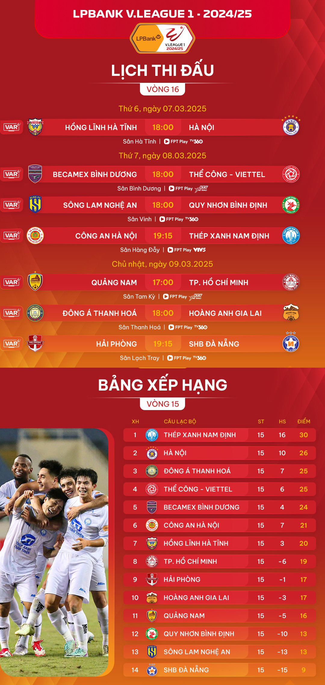 [Infographic] Lịch thi đấu vòng 16 V-League: Thép Xanh Nam Định chạm trán Công an Hà Nội