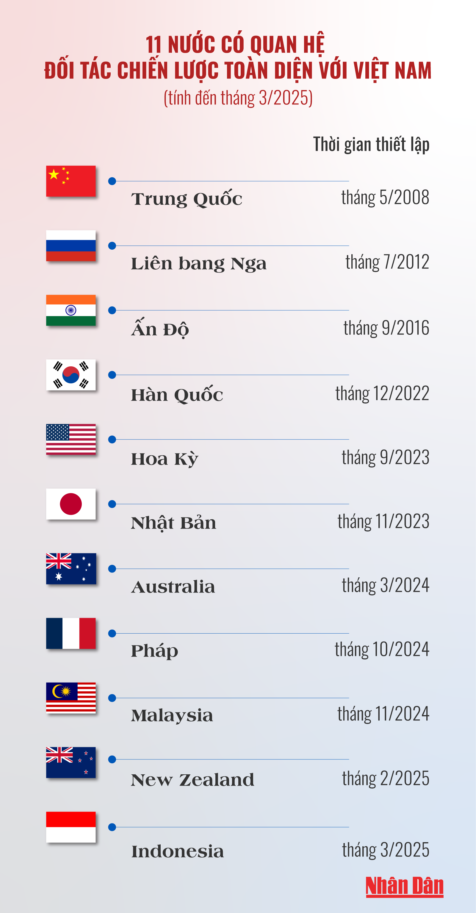 Ngày 10/3, trong khuôn khổ chuyến thăm cấp Nhà nước tới Cộng hòa Indonesia, Tổng Bí thư Tô Lâm và Tổng thống Cộng hòa Indonesia, Chủ tịch Đảng Phong trào Indonesia vĩ đại (Gerindra) Prabowo Subianto chủ trì cuộc gặp gỡ báo chí để thông tin về kết quả hội đàm và chính thức công bố nâng cấp quan hệ Việt Nam-Indonesia lên Đối tác chiến lược toàn diện.