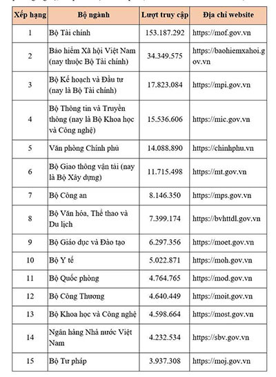 Cùng với Bảo hiểm xã hội Việt Nam, Cổng thông tin điện tử của 4 cơ quan khác cũng thuộc nhóm dẫn đầu về số lượt truy cập trong năm 2024, gồm: Bộ Tài chính, Bộ Kế hoạch và Đầu tư (nay là Bộ Tài chính), Bộ Thông tin và Truyền thông (nay là Bộ Khoa học và Công nghệ), Văn phòng Chính phủ.