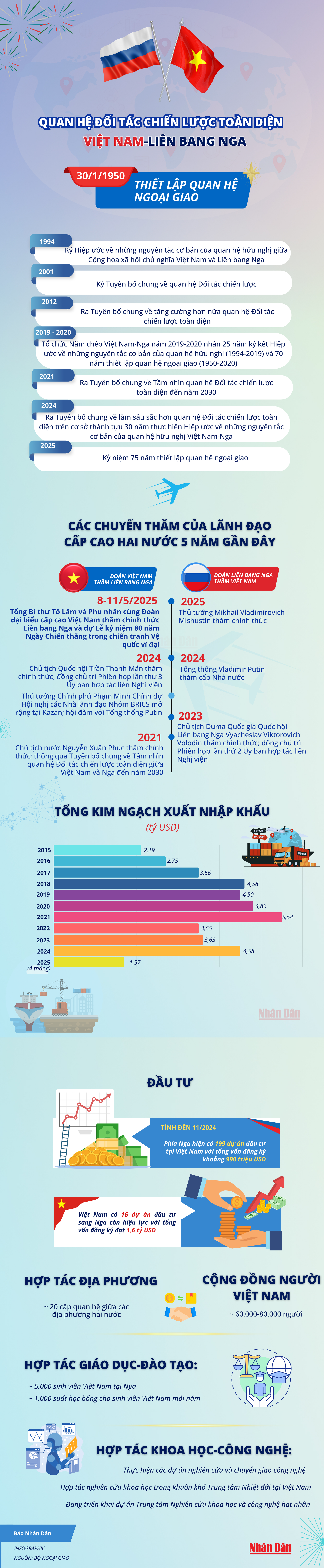 Trải qua 75 năm kể từ khi thiết lập quan hệ ngoại giao ngày 30/1/1950, quan hệ hữu nghị truyền thống, Đối tác chiến lược toàn diện giữa Việt Nam với Liên bang Nga không ngừng được củng cố, ngày càng phát triển sâu rộng trên tất cả các lĩnh vực.