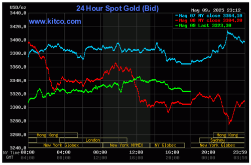Tính đến 10 giờ 30 phút ngày 10/5 (giờ Việt Nam), giá vàng thế giới tăng 19,1 USD/ounce so kết phiên hôm trước lên mức 3.323,3 USD/ounce.