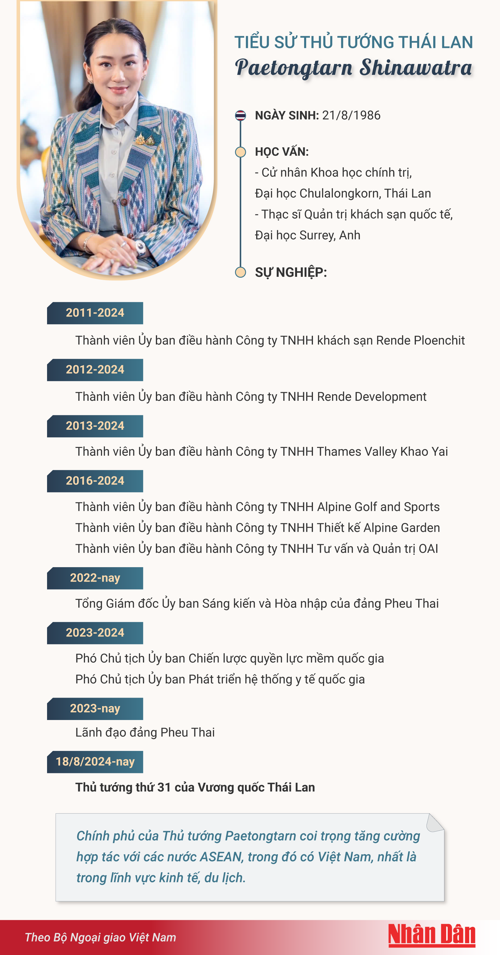 Năm 2024, bà Paetongtarn Shinawatra nhậm chức Thủ tướng thứ 31 của Thái Lan và trở thành nữ Thủ tướng trẻ tuổi nhất trong lịch sử quốc gia này. Chính phủ của bà coi trọng tăng cường hợp tác với các nước ASEAN, trong đó có Việt Nam, nhất là trong lĩnh vực kinh tế, du lịch.