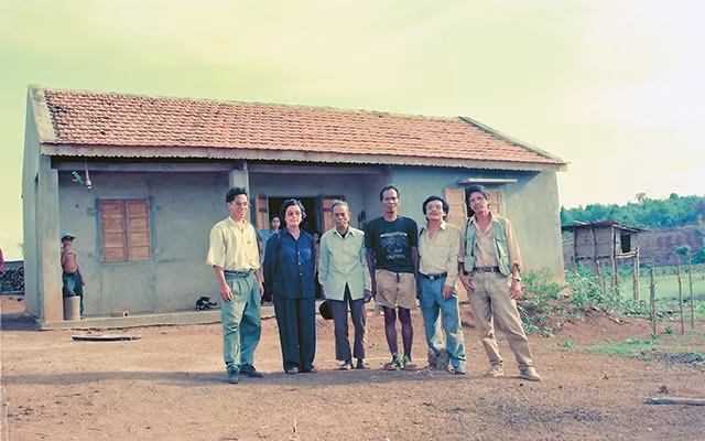 Anh hùng A Sanh (người thứ ba, từ phải sang) gặp gỡ tác giả (bên trái A Sanh) tại nhà của mình.Ảnh: Lê Bá Dương