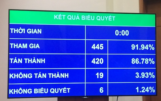 Kết quả lấy ý kiến cho thấy, có 445 đại biểu tham gia biểu quyết, trong đó có 420 đại biểu tán thành (chiếm 86,78%); 19 đại biểu không tán thành (chiếm 3,93%); số đại biểu không tham gia biểu quyết là sáu (chiếm 1,24%).