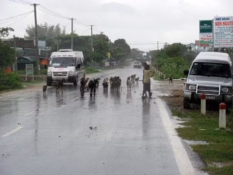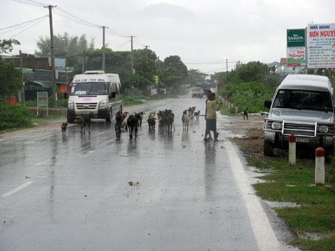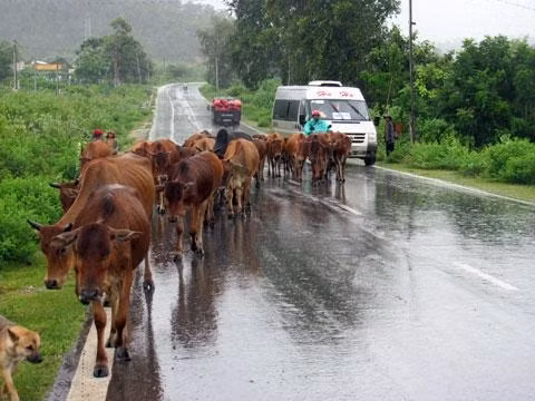 Cũng trên tuyến đường đau khổ này, buổi sáng sớm hoặc buổi chiều, ngoài sự xuống cấp của con đường, các lái xe còn phải đối phó với một chướng ngại vô cùng phức tạp đó là cảnh bò đàn, dê đàn dàn hàng ngang trên đường.