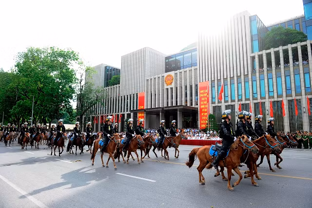 Lực lượng Cảnh sát cơ động Kỵ binh diễu hành trên đường Độc Lập.