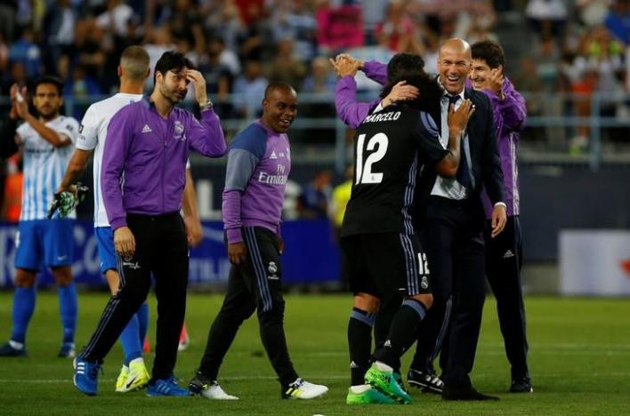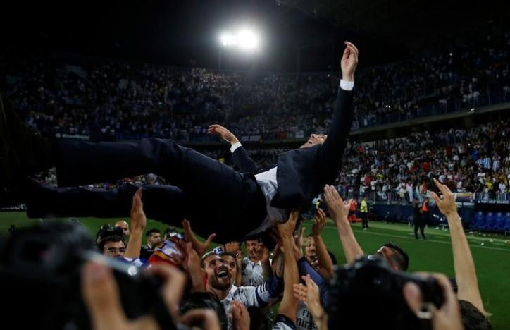 Chiến lược gia người Pháp Zinedine Zidane được các học trò tung hô sau chiến thắng quyết định trên sân của Malaga ở vòng 38.