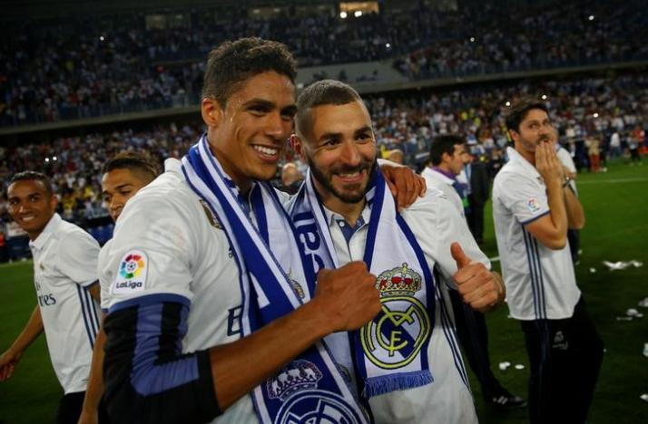 Raphael Varane và Karim Benzema ăn mừng chiến thắng.