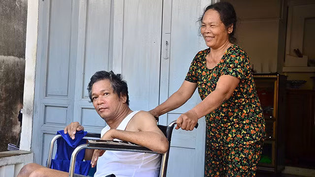 “Hôm nay gieo mớ hành cho kịp trời mưa nhưng cũng chưa xong. Tui phải về cơm nước với ông đã”, vừa giải thích, hai tay bà đỡ vai chồng. Cả người bà là trụ cho ông tựa vào ngồi dậy. Kéo tay chồng bá cổ, bà dùng hết sức mình đỡ người ông đưa qua chiếc xe lăn cạnh giường. Vài phút sau, khi ông yên vị, bà đưa ra sân hóng mát.