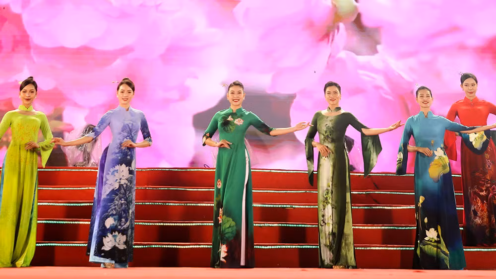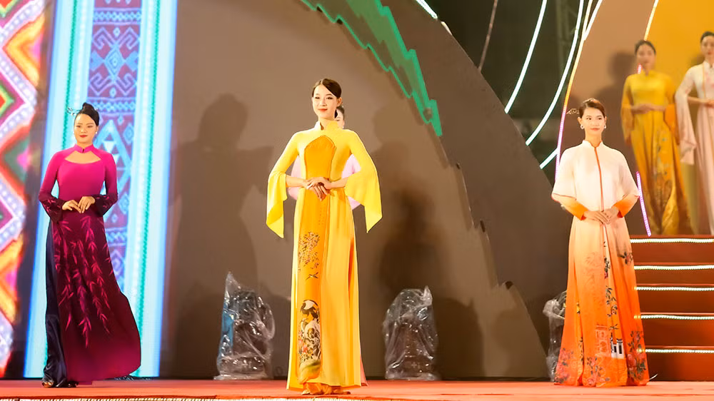 | Nhà thiết kế Vũ Thảo Giang (áo dài xanh) và các đại biểu khách mời tại Lễ hội. |
