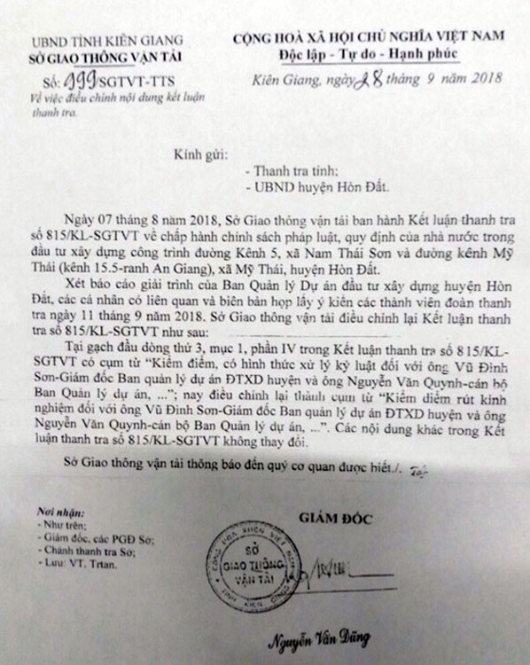 Văn bản điều chỉnh hình thức kỷ luật ông Vũ Đình Sơn của Giám đốc Sở Giao thông vận tải Kiên Giang.