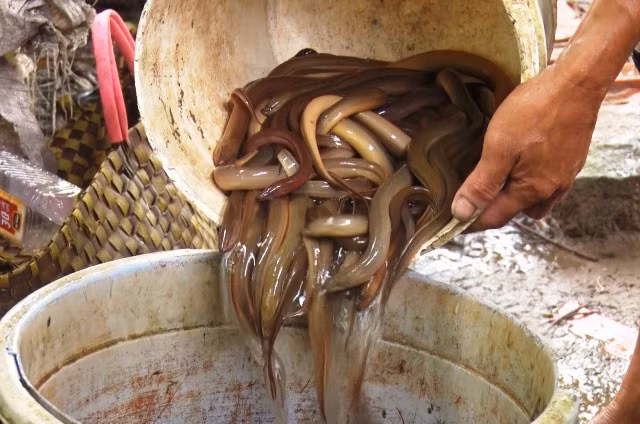 Năm giờ sáng, mặt trời còn chưa thức dậy, ông Hai Đen, nhà bên cạnh đã sang tìm “đồng nghiệp” trẻ uống nước trà. Đó là thói quen của hai ngư dân này hàng chục năm qua. Ông Hai Đen cũng là một tay lão làng trong nghề đặt trúm lươn ở xứ này. Trà nước xong, mỗi người một hướng, tỏa ra cánh đồng nước nổi. Tôi lại theo chân anh Vũ ra đồng thăm trúm. Vừa giở ống trúm đầu tiên lên, Vũ phán chắc nịch: “Có lươn, hai con, một con trọng trọng và một con lươn nhỏ”. Rồi những chiếc trúm tiếp theo cũng có từ một đến hai con lươn. Có chiếc còn dính cả rắn trun. Con rắn này giở thói háo ăn, chui vào trong trúm nuốt liền tù tì ba con lươn vô bụng. “Nay nước chớm đồng nên lươn lên cạn kiếm mồi, chạy bộn. Còn hai ba chục ống trúm nữa, chắc được tầm năm bảy ký”, anh Vũ đoán.
