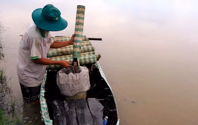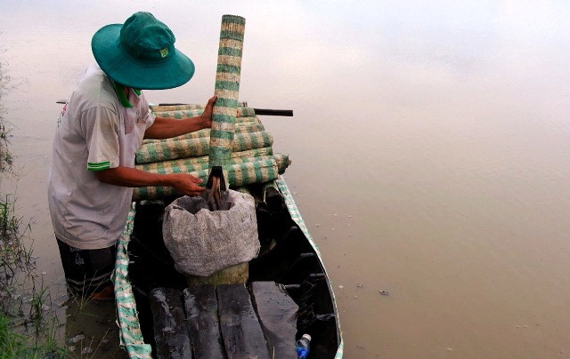 Ở phía bờ đê bao bên cạnh, tôi thấy ông Hai Đen liên tục giơ những ống trum lên cao, với vẻ phấn khích lắm. Anh Vũ bảo: “Ổng trúng luồng lươn lớn rồi nên khoe vậy. Dọc theo chân con đê này cứ cách một hai đêm lại có một luồng lươn chạy. Anh em tụi tui trong nghề cứ chia nhau mỗi người đặt ở đó một ngày”. Sau khi kiểm tra kỹ tất cả các địa điểm đặt ống trúm từ chiều tối hôm qua, chúng tôi trở về kênh K-H 6 cũng là lúc mặt trời lên khỏi đọt dừa. Cánh “thợ săn” lươn trong xóm cũng bắt đầu đem chiến lợi phẩm của một đêm vất vả ra “khoe” với nhau và bàn tính địa bàn đặt cho cữ mới.