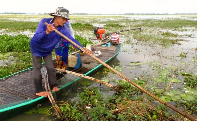 Cạnh xuồng anh Sul là xuồng của vợ chồng “đồng nghiệp” Lê Phi Hùng, cũng là cư dân biên giới. Anh Hùng có kinh nghiệm hơn 10 năm làm nghề xúc ụ lươn trên cánh đồng ngập nước này, từ khi chưa cưới vợ. Giờ thì đã có hai con, mà cũng không thể chuyển làm nghề gì khác được. “Bởi cái nghề này không đòi hỏi vốn liếng đầu tư nhiều quá. Chỉ vài triệu đồng mua tấm lưới, chiếc xuồng rồi đốn cây tre uốn cong thành chiếc gọng vợt là có thể hành nghề”, anh Hùng giải thích.