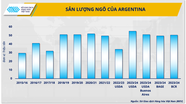 Trong báo cáo mới nhất, Bộ Nông nghiệp Mỹ chi nhánh tại Buenos Aires đã hạ dự báo sản lượng ngô niên vụ 2023/24 của Argentina xuống chỉ còn 51 triệu tấn, thấp hơn so với mức 55 triệu tấn đưa ra trong báo cáo WASDE tháng 4 do dịch bệnh ở ngô lan rộng. Trong khi đó, hai Sở Giao dịch ngũ cốc lớn nhất của Argentina là Buenos Aires (BAGE) và Rosario (BCR) cũng lần lượt hạ dự báo sản lượng xuống còn chỉ còn 49,5 triệu tấn và 50,5 triệu tấn.