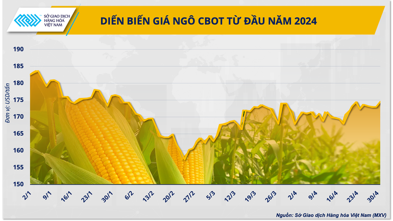 Theo Sở Giao dịch Hàng hóa Việt Nam (MXV), giá ngô trên Sở Giao dịch Hàng hóa Chicago đang ghi nhận sự hồi phục mạnh mẽ sau xu hướng giảm liên tục kể từ tháng 6/2023. Trong vòng 2 tháng qua, giá mặt hàng này đã tăng tới 13,2%, cho thấy rủi ro thiếu hụt nguồn cung đang dần gia tăng.