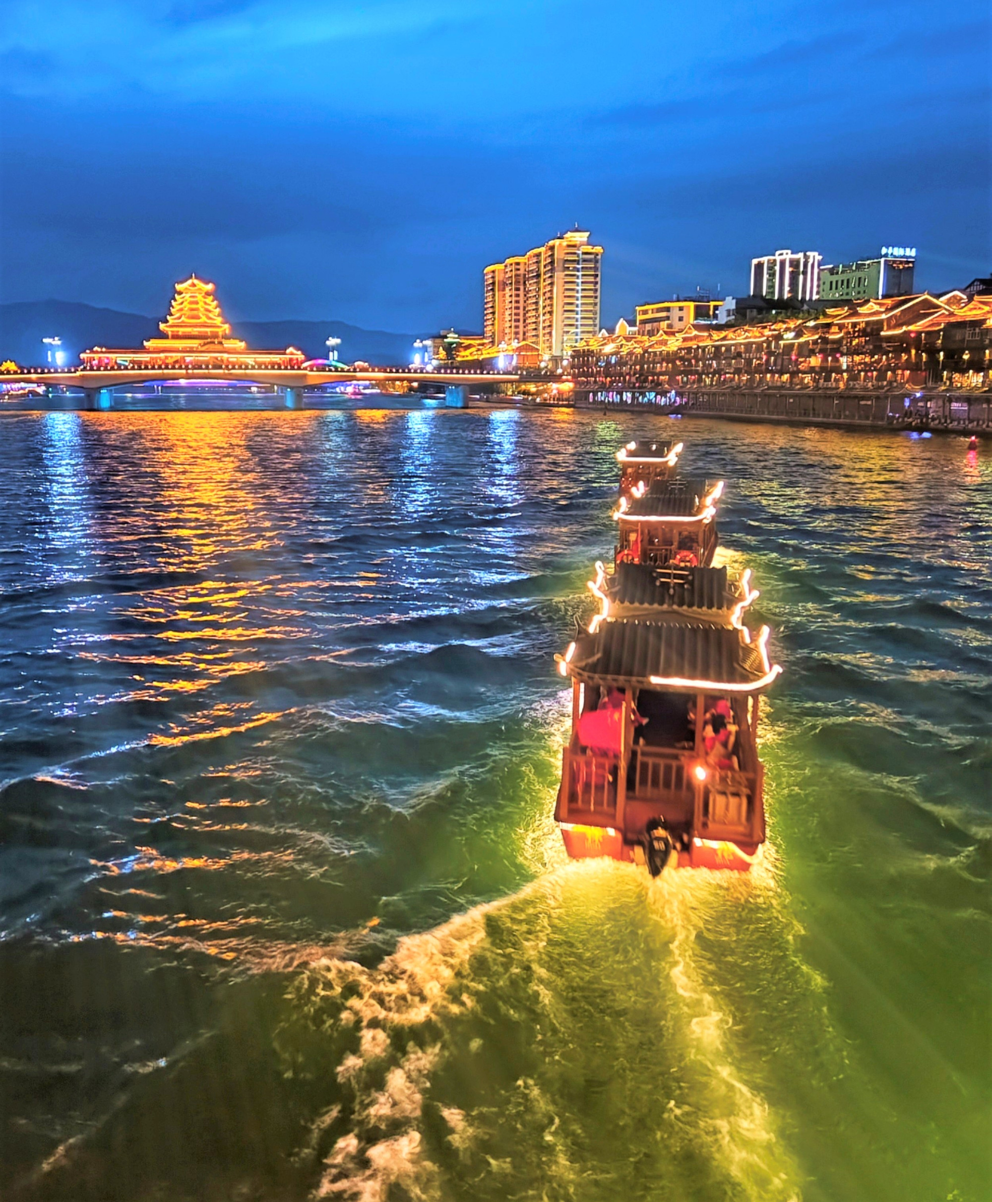 Du khách có thể ngồi thuyền trên lộ trình 3km, với thời gian trải nghiệm 40 phút, tham quan 11 điểm đến chính của địa phương như cầu Long Tân, cầu Hòa Bình, Thiên hậu cung…