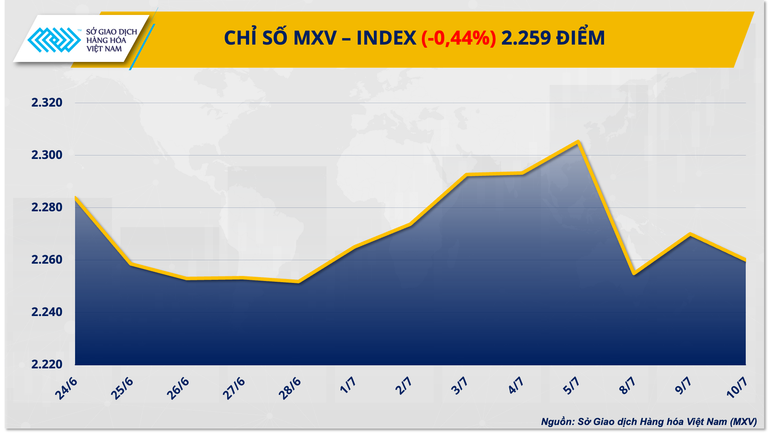 Theo Sở Giao dịch hàng hóa Việt Nam (MXV), thị trường nông sản và nguyên liệu công nghiệp chìm trong sắc đỏ khi đóng cửa phiên giao dịch ngày hôm qua (10/7).