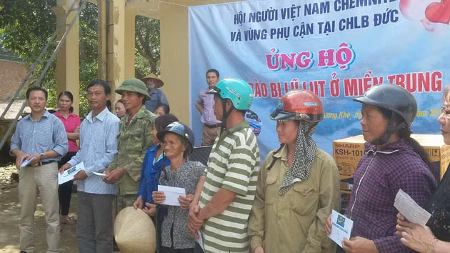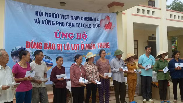 | Đại diện Hội người Việt Chemnitz và phụ cận trong hai ngày 21, 22-11 vừa qua đã đến thăm và hỗ trợ lũ lụt cho đồng bào một số xã tại Hương Khê (Hà Tĩnh) và Bố Trạch (Quảng Bình) 10.000 euro, tương đương với gần 240 triệu đồng, được phân bổ như sau: Hương Khê: 7.000 euro, tương đương 168 triệu đồng: - Tiền mặt: Tặng 100 suất quà (mỗi suất 500 nghìn đồng) cho hộ gia đình khó khăn ở Phúc Đồng, 34 suất (mỗi suất 500 nghìn đồng) ở xã Hương Thủy; Trường mầm non Hương Thủy: 15 triệu đồng; Trường mầm non Hà Linh: 10 triệu đồng; - Hỗ trợ cho Trường mầm non Phúc Đồng, Trạm xá Hà Linh, Trạm xá Hương Thủy, Trạm xá Phúc Đồng bằng trang thiết bị y tế và trường học bằng hiện vật trị giá hơn 70 triệu đồng. Bố Trạch: 3.000 euro, tương đương 72 triệu đồng. Trong đó, Trường tiểu học Phúc Trạch 2 hỗ trợ số tiền mặt là 34 triệu đồng để khoan giếng và xây dựng bể chứa nước sạch; Trường tiểu học Hoàn Lão: hai bộ máy vi tính; Trường mầm non Phúc Trạch và Trường mầm non Cự Nẫm hỗ trợ hiện vật trị giá 11 triệu đồng mỗi trường. |