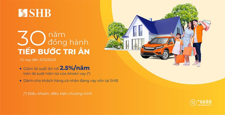 Thấu hiểu nhu cầu sử dụng vốn vào mùa cao điểm cuối năm, từ nay đến 31/12/2023, Ngân hàng Sài Gòn - Hà Nội (SHB) triển khai chương trình “30 năm đồng hành – Tiếp bước tri ân” ưu đãi lãi suất vay hấp dẫn dành cho các khách hàng cá nhân (KHCN). Tổng hạn mức ưu đãi lên đến 5.000 tỷ đồng.