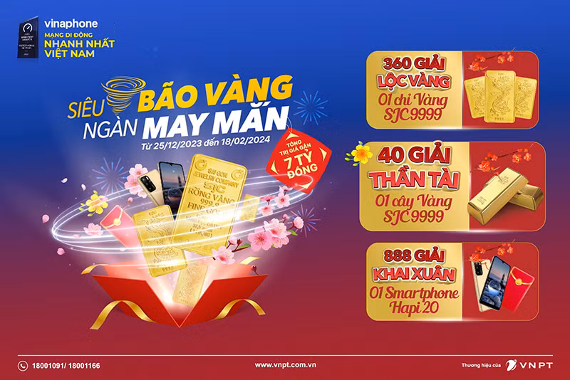 Từ ngày 25/12/2023 đến hết 18/2/2024, VinaPhone tưng bừng khuyến mại đón Tết Dương Lịch 2024 và Tết Nguyên đán Giáp Thìn. Tất cả khách hàng tham gia sẽ có cơ hội trúng ngay 40 giải Thần Tài mỗi giải 1 cây vàng SJC 9999, 360 giải Lộc Vàng mỗi giải 1 chỉ vàng SJC 9999, 888 giải Khai Xuân mỗi giải 1 smartphone Hapi20. Tổng giá trị giải thưởng của chương trình lên đến gần 7 tỷ đồng.