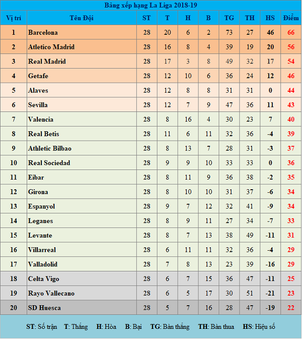 Ở đáy bảng xếp hạng, cuộc chiến giành suất trụ hạng đang dần trở nên khốc liệt khi La Liga bắt đầu bước vào những vòng cuối. Ở vòng 28 vừa qua, cả ba đội đang xếp ở nhóm “cầm đèn đỏ” đều thua, trong khi hai đội ngấp nghé khu vực nguy hiểm là Real Valladolid và Villarreal (lần lượt ở vị trí thứ 16 và 17) lại cùng giành được những chiến thắng quan trọng để tạm bứt khỏi tốp xuống hạng.