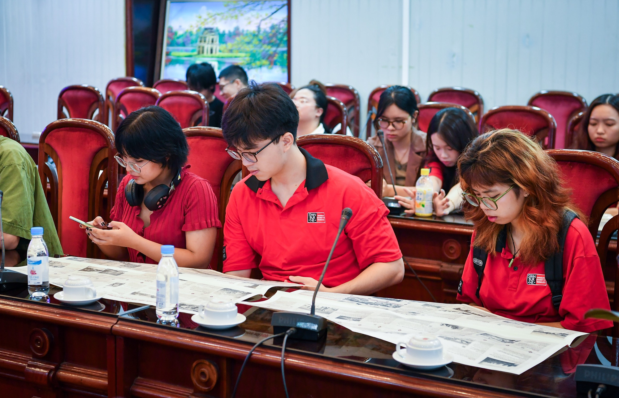 | Các sinh viên chăm chú nghe giới thiệu về lịch sử hình thành và phát triển của Báo Nhân Dân. |