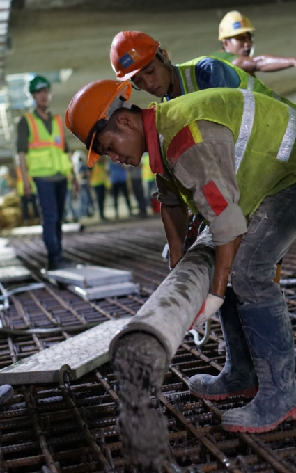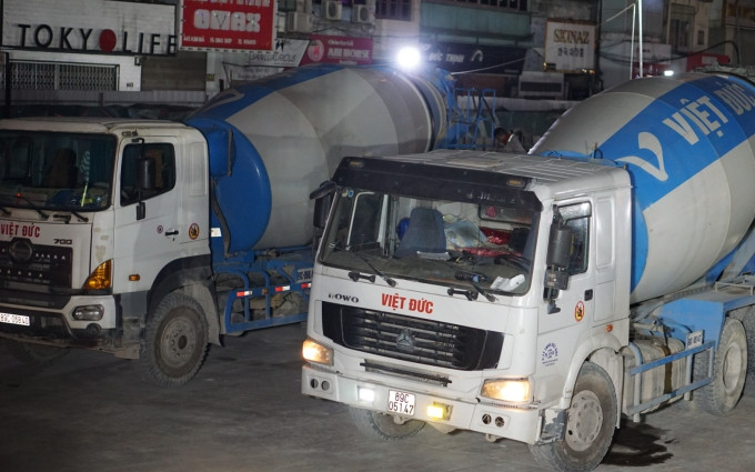 Công nhân làm xuyên đêm, từ 22 giờ ngày 24-6 đến 5 giờ sáng ngày 25-6, để đổ bê-tông hợp long trung chuyển ga ngầm S9.