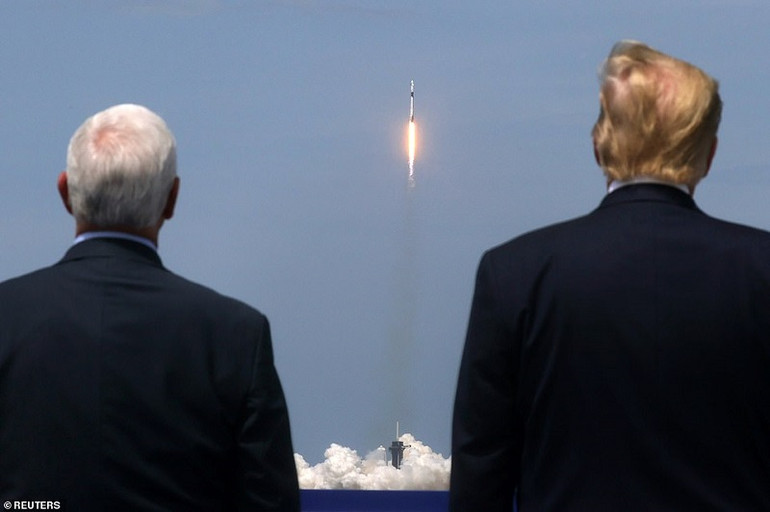 Tổng thống Donald Trump và Phó Tổng thống Mike Pence theo dõi vụ phóng tên lửa Falcon 9 từ xa. Ảnh: Reuters.
