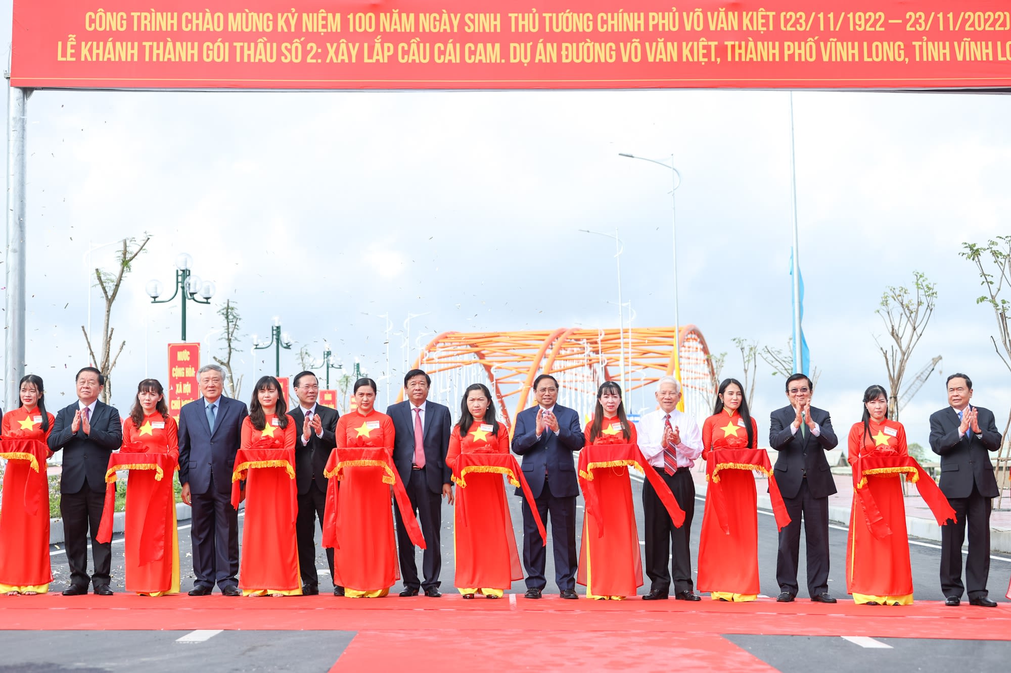 Thủ tướng Phạm Minh Chính dự lễ khánh thành cầu Cái Cam thuộc dự án đầu tư xây dựng công trình đường Võ Văn Kiệt, một trong những tuyến đường giao thông trọng điểm của TP Vĩnh Long. Ảnh: VGP