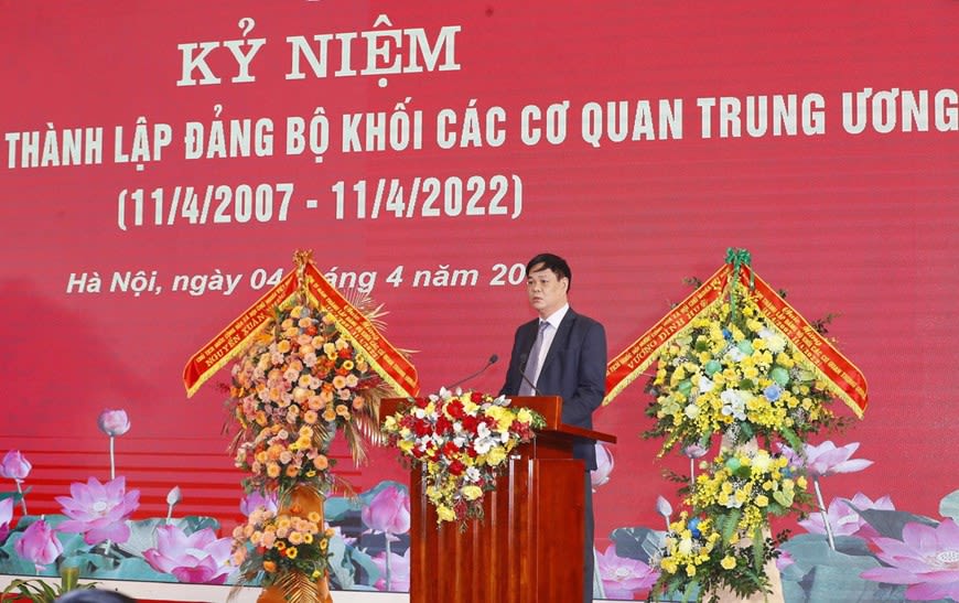 Hôm nay tôi rất vui mừng đến dự buổi Kỷ niệm 15 năm Ngày thành lập Đảng bộ Khối các cơ quan Trung ương. Thay mặt Lãnh đạo Đảng, Nhà nước, tôi gửi tới các đồng chí lãnh đạo, nguyên lãnh đạo Đảng ủy Khối qua các thời kỳ cùng toàn thể cán bộ, đảng viên của Đảng bộ và các đồng chí đại biểu những tình cảm thân thiết và lời chúc mừng tốt đẹp nhất.