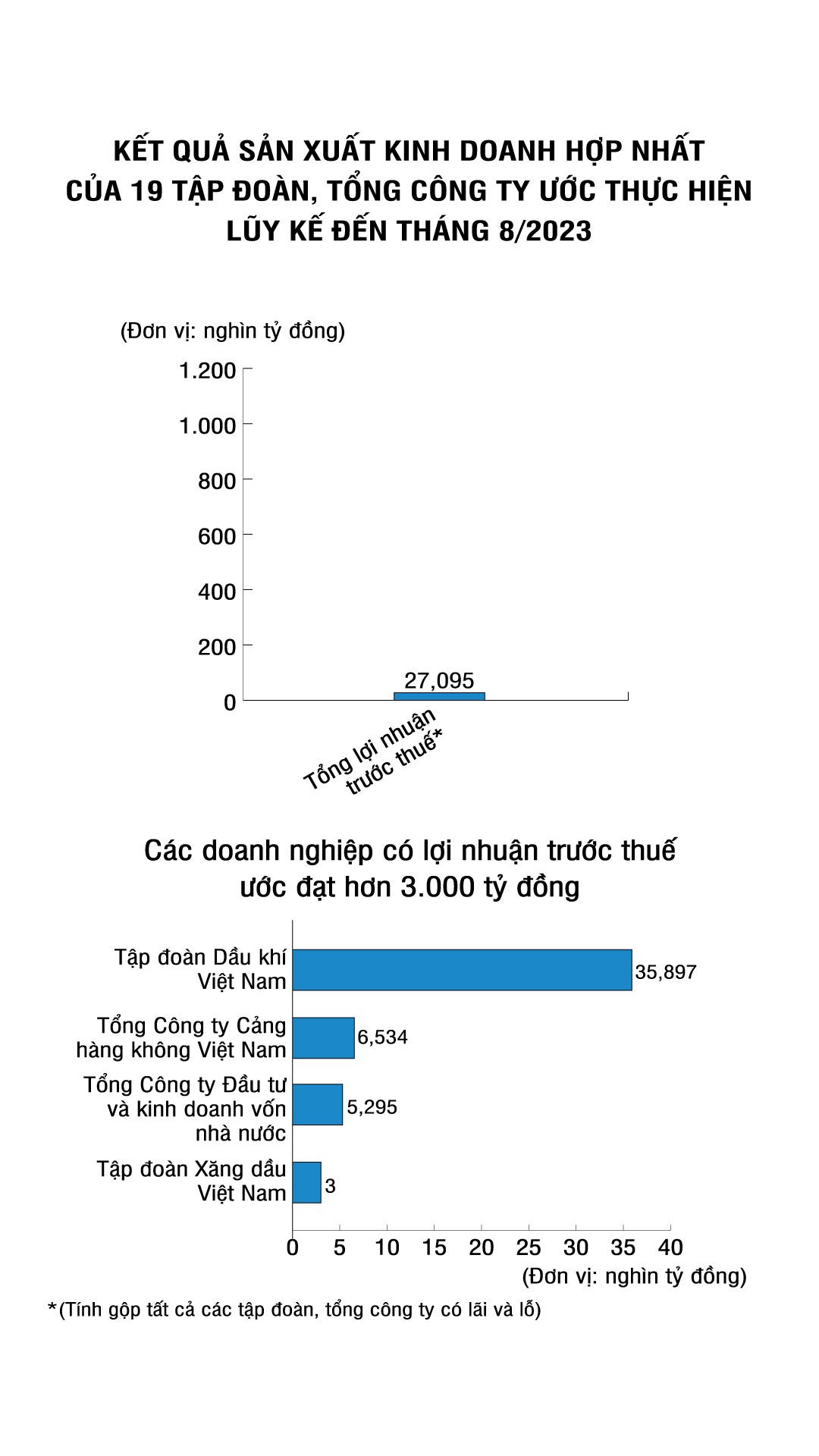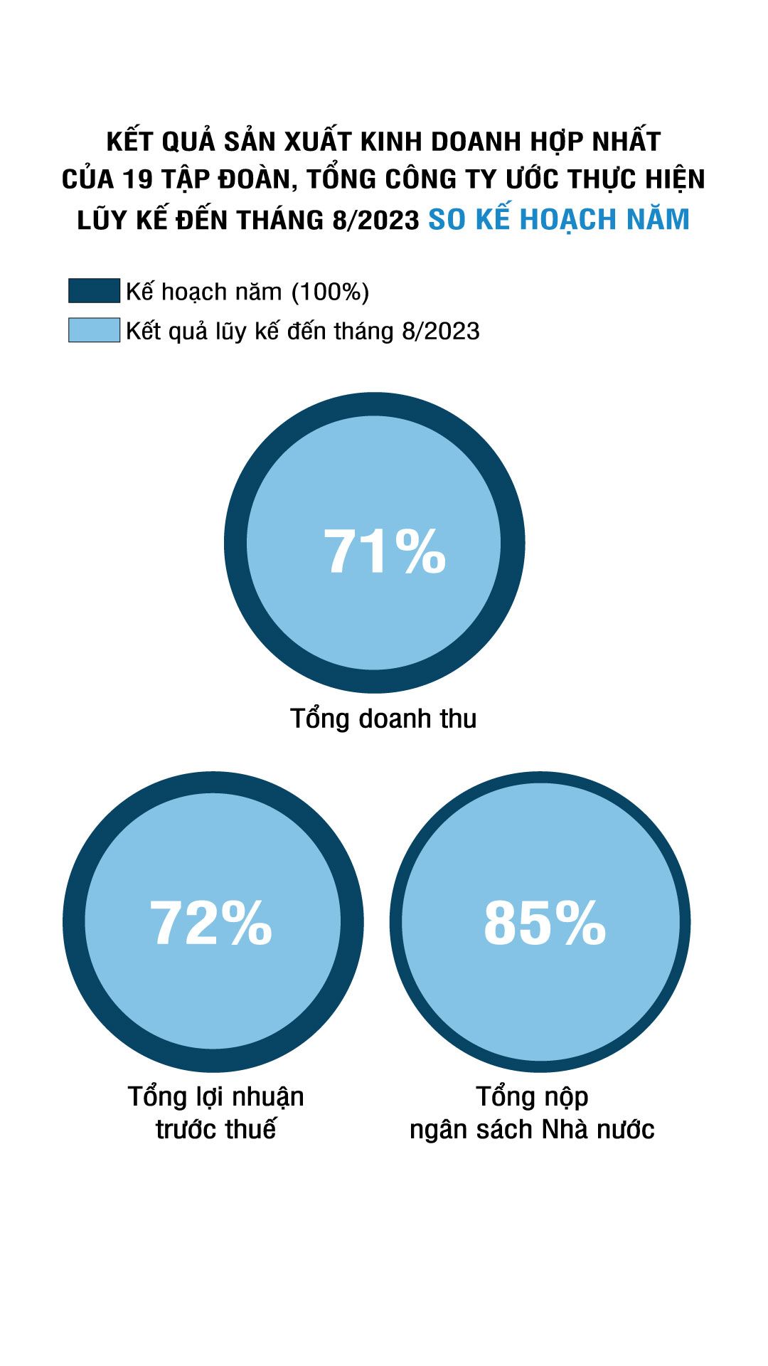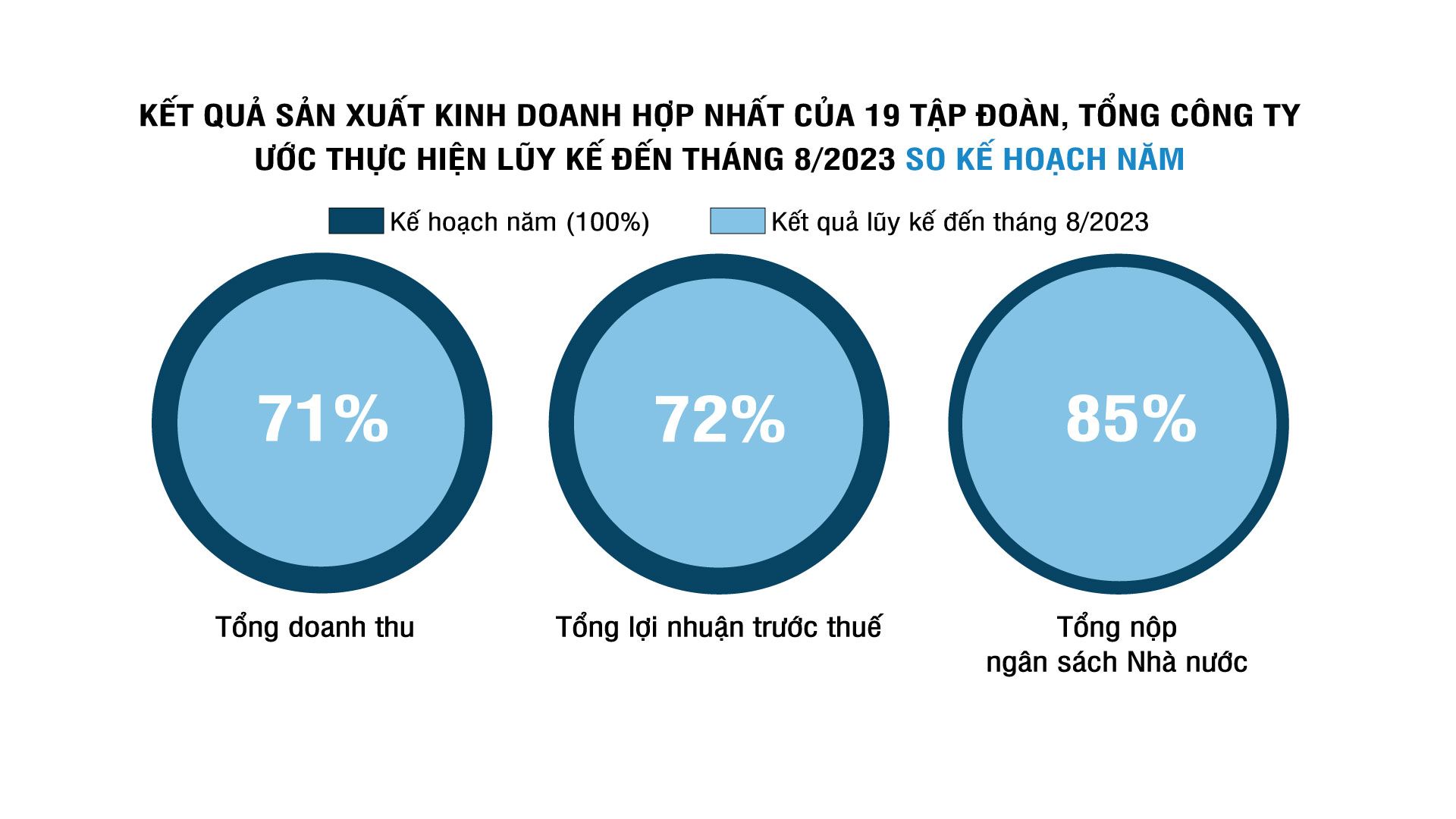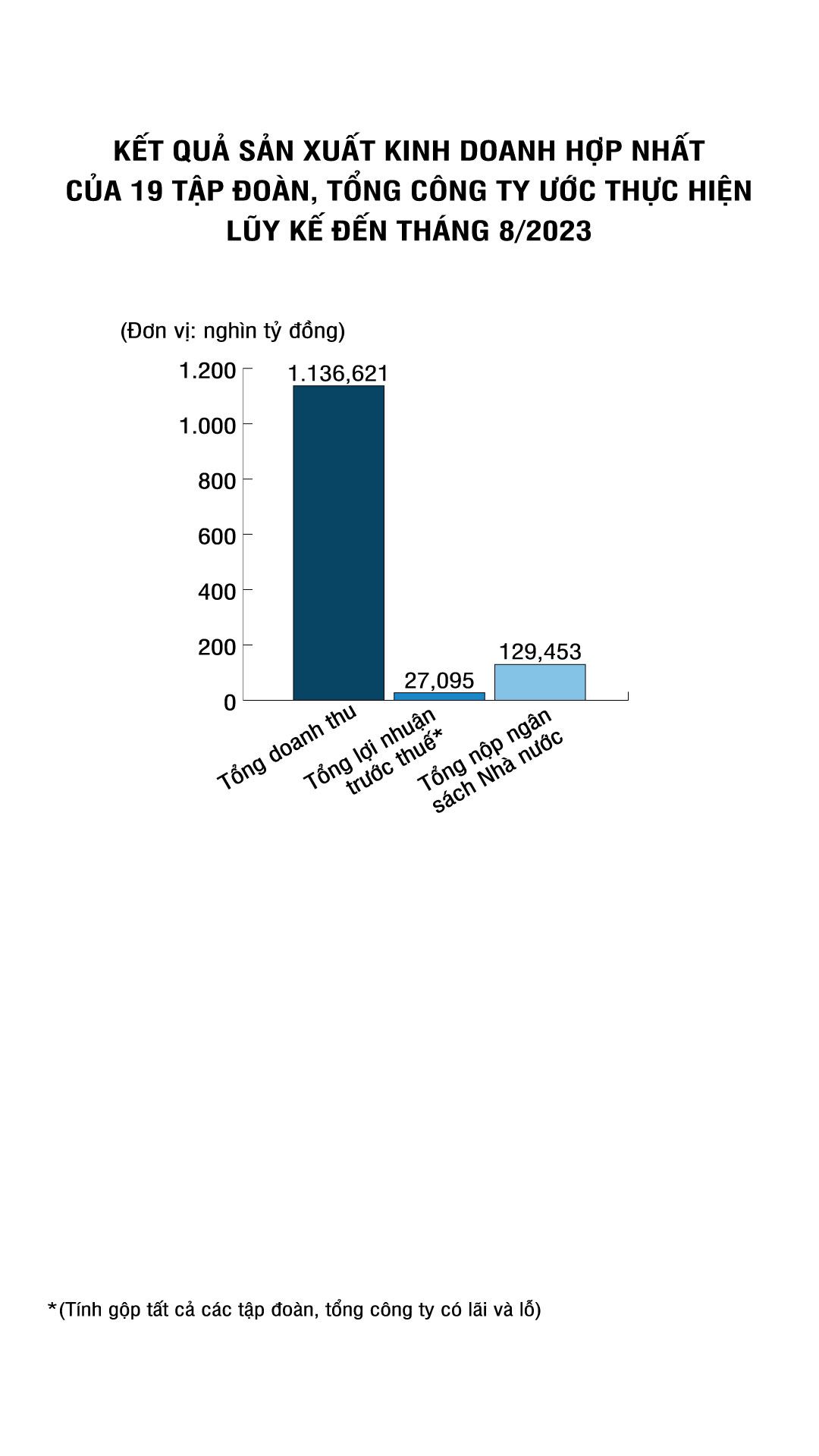 Về kết quả sản xuất kinh doanh hợp nhất, ước thực hiện lũy kế đến tháng 8/2023, tổng doanh thu của 19 tập đoàn, tổng công ty ước đạt 1.136.621 tỷ đồng, bằng 71% kế hoạch năm và 102% so với cùng kỳ; tổng lợi nhuận trước thuế đạt 27.095 tỷ đồng, bằng 72% kế hoạch năm và 133% so với cùng kỳ năm trước liền kề;