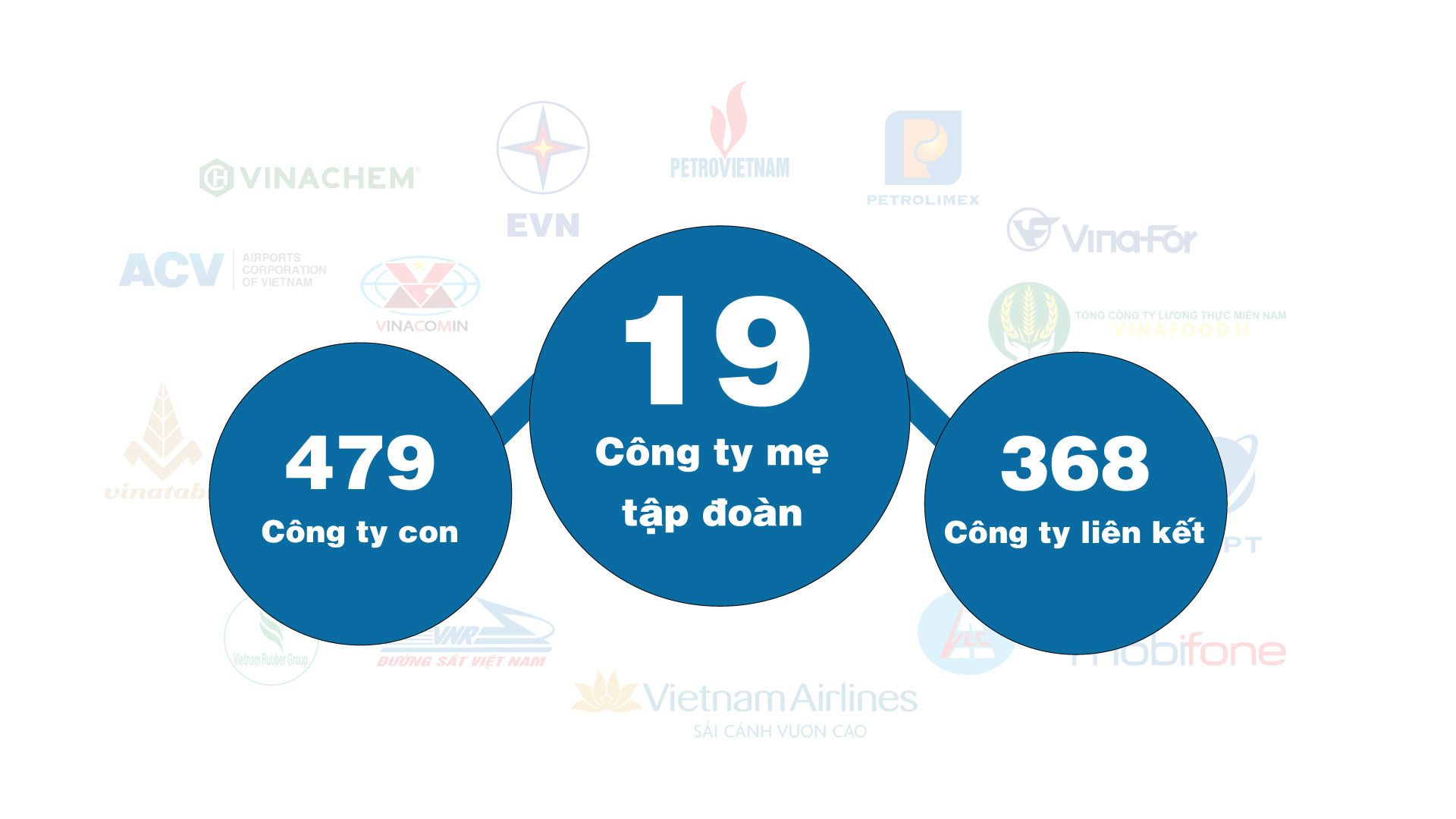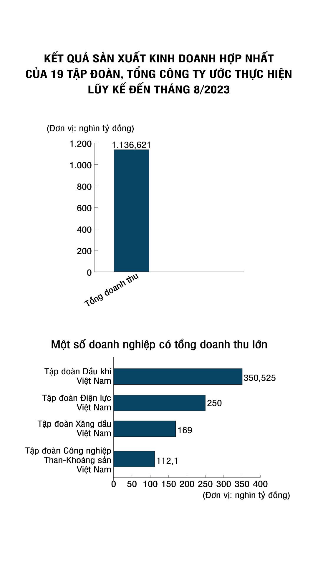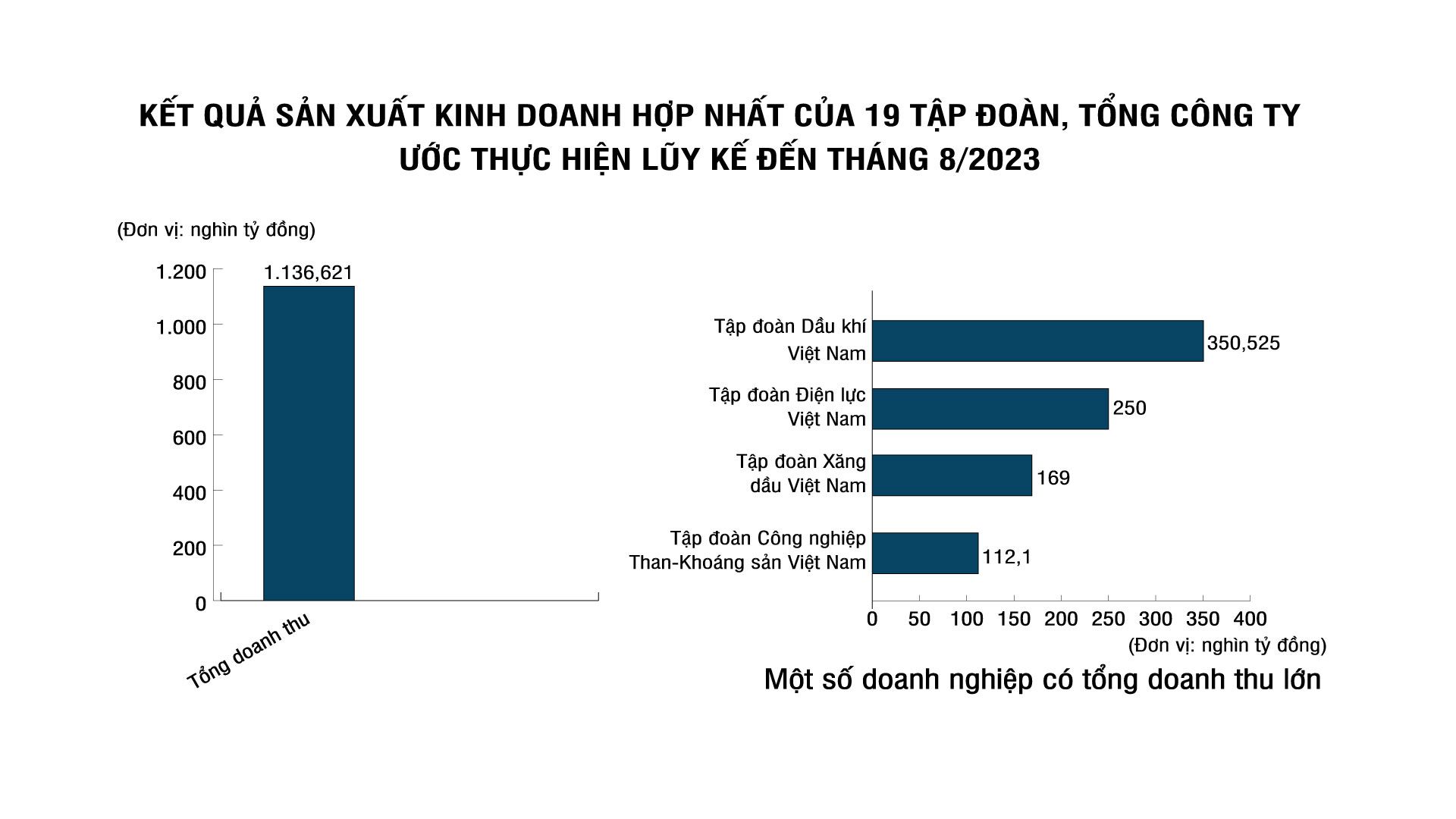 Kết quả sản xuất kinh doanh công ty mẹ của 19 tập đoàn, tổng công ty trong tám tháng năm 2023 ước đạt tổng doanh thu 781.973 tỷ đồng (bằng 114% kế hoạch năm và tăng 5% so với cùng kỳ). Một số doanh nghiệp có tổng doanh thu lớn như: Tập đoàn Dầu khí Việt Nam (PVN), Tập đoàn Điện lực Việt Nam (EVN), Tập đoàn Công nghiệp Than-Khoáng sản Việt Nam (TKV), Tập đoàn Xăng dầu Việt Nam (Petrolimex).