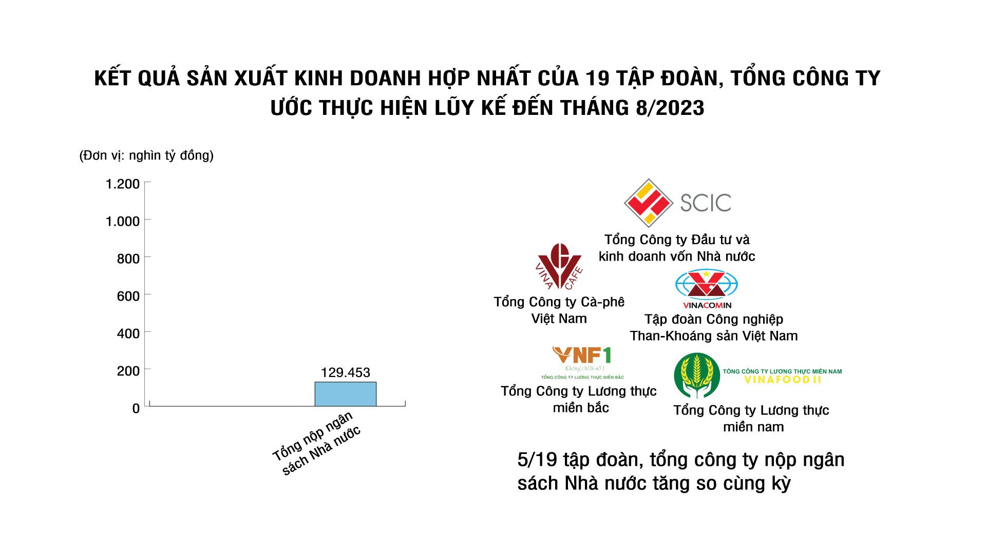 Tổng nộp ngân sách nhà nước đạt 129.453 tỷ đồng, bằng 85% kế hoạch năm và 102% so với cùng kỳ. Trong đó có 5/19 tập đoàn, tổng công ty nộp ngân sách nhà nước tăng so với cùng kỳ gồm SCIC, TKV, Vinafood 2, Tổng công ty Lương thực miền Bắc (Vinafood 1), Tổng công ty Cà phê Việt Nam (Vinacafe).