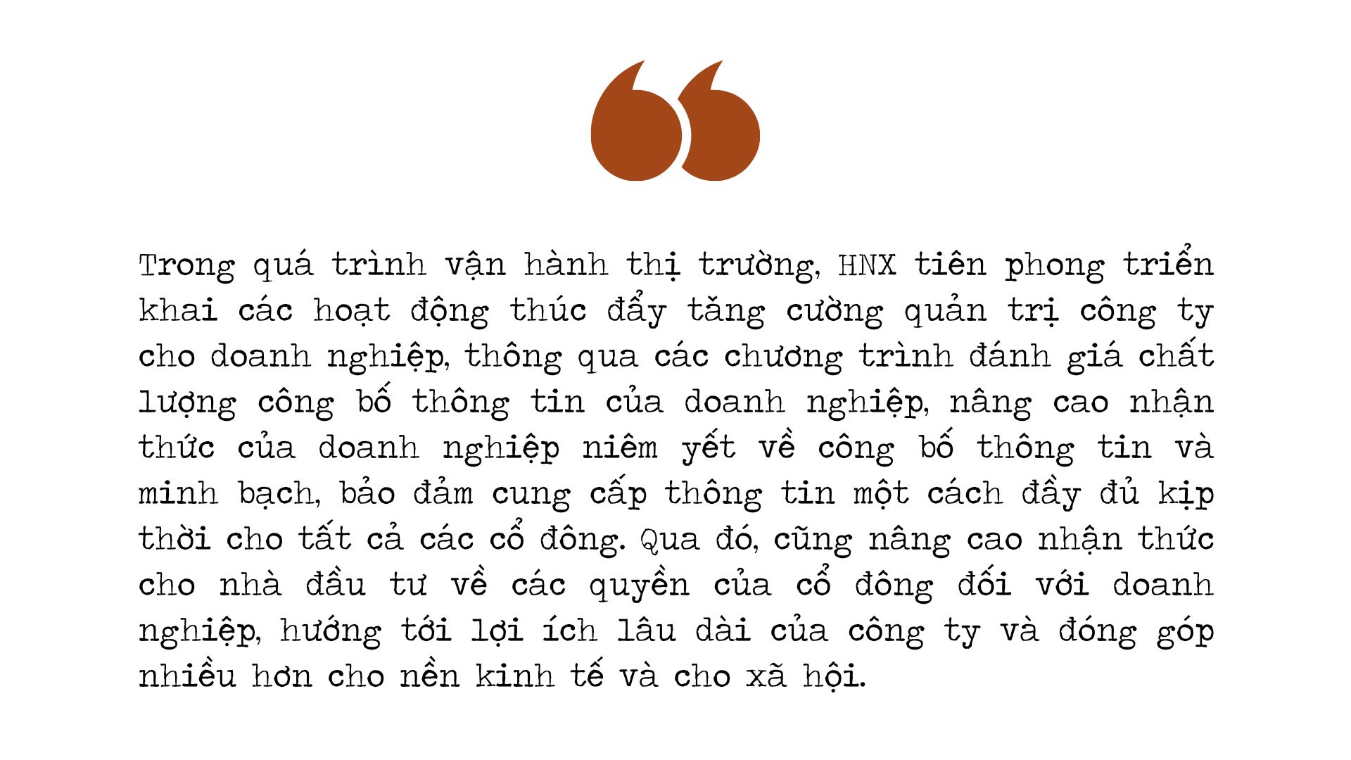 Trong quá trình vận hành thị trường, HNX tiên phong triển khai các hoạt động thúc đẩy tăng cường quản trị công ty cho doanh nghiệp, thông qua các chương trình đánh giá chất lượng công bố thông tin của doanh nghiệp, nâng cao nhận thức của doanh nghiệp niêm yết về công bố thông tin và minh bạch, bảo đảm cung cấp thông tin một cách đầy đủ kịp thời cho tất cả các cổ đông. Qua đó, cũng nâng cao nhận thức cho nhà đầu tư về các quyền của cổ đông đối với doanh nghiệp, hướng tới lợi ích lâu dài của công ty và đóng góp nhiều hơn cho nền kinh tế và cho xã hội