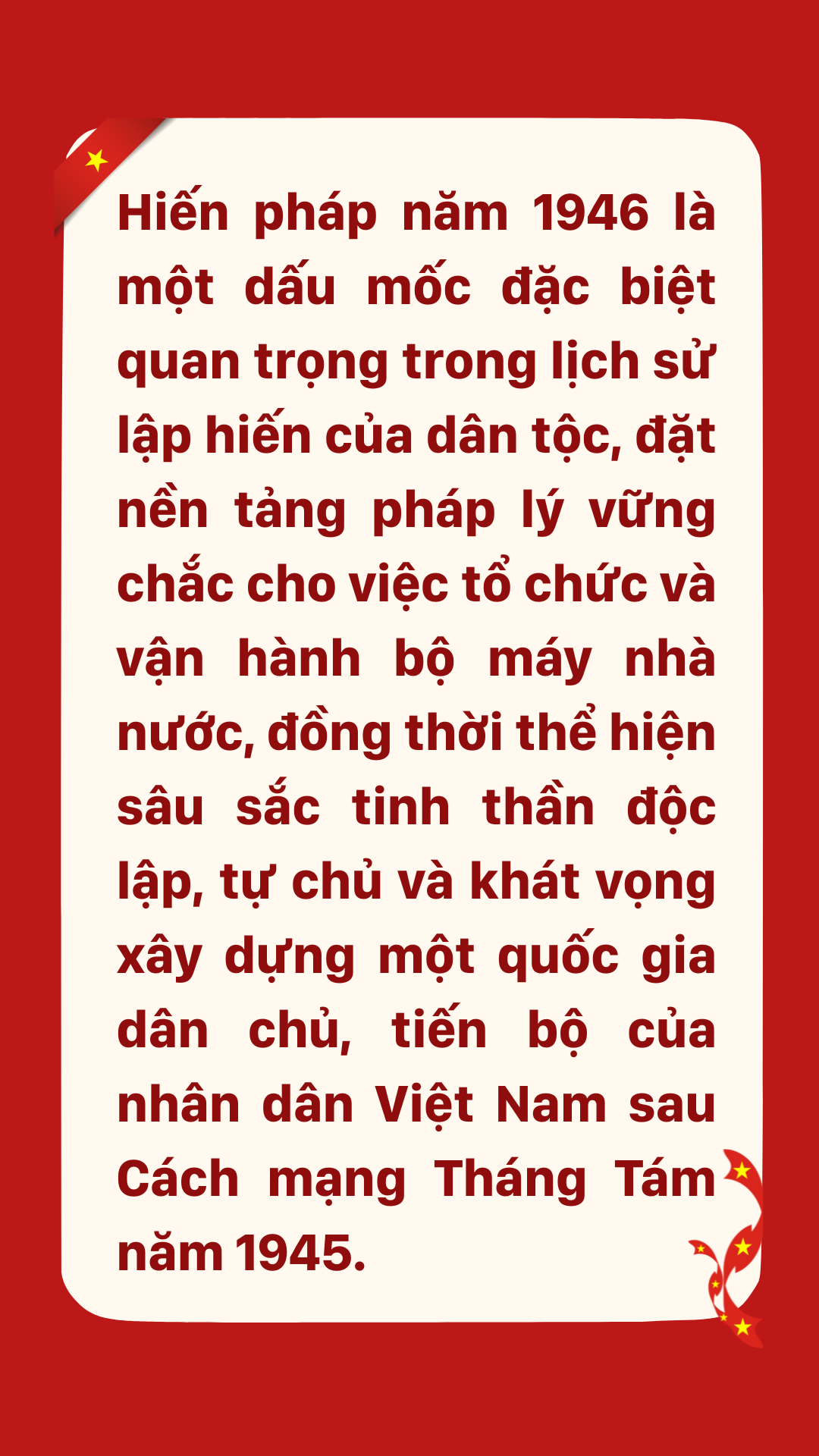 Với giá trị lịch sử và pháp lý to lớn, Hiến pháp năm 1946 xứng đáng là một trong những thành tựu tiêu biểu nhất của thời kỳ đầu lập quốc, là cột mốc đánh dấu bước trưởng thành đầu tiên của nền lập hiến Việt Nam hiện đại.