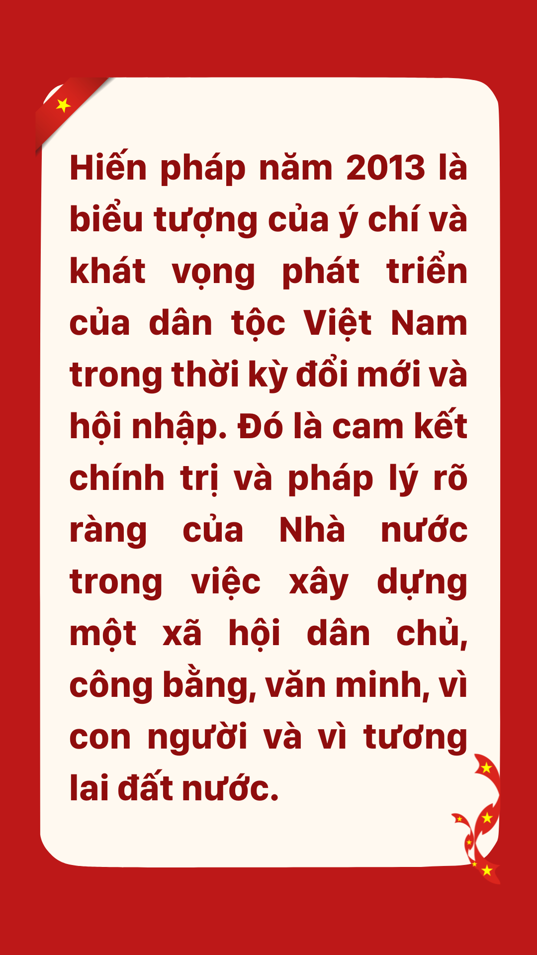 Hiến pháp năm 2013 là biểu tượng của ý chí và khát vọng phát triển của dân tộc Việt Nam trong thời kỳ đổi mới và hội nhập. Đó là cam kết chính trị và pháp lý rõ ràng của Nhà nước trong việc xây dựng một xã hội dân chủ, công bằng, văn minh, vì con người và vì tương lai đất nước.