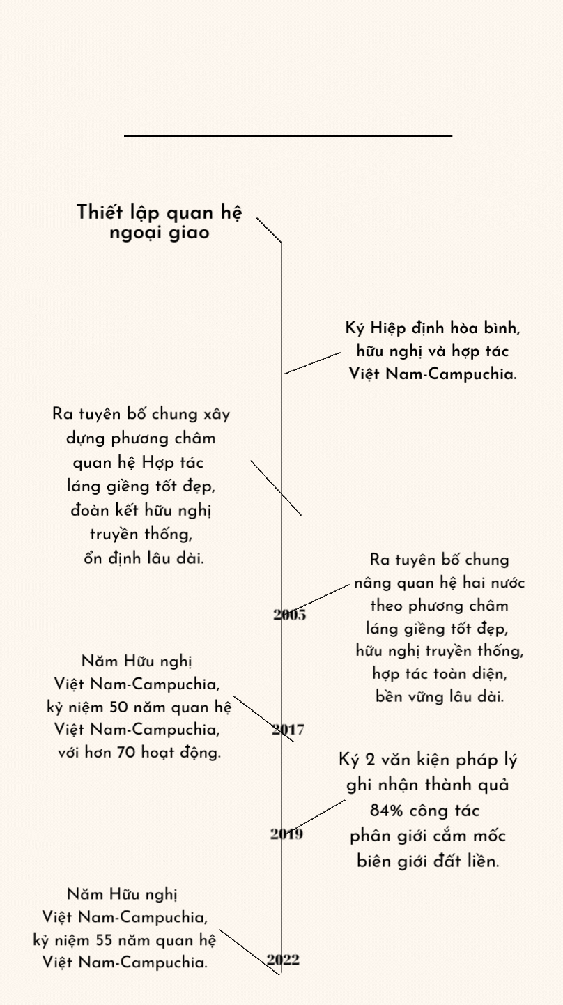 Việt Nam và Campuchia là hai nước láng giềng gần gũi và có mối quan hệ truyền thống, gắn bó từ lâu đời. Mối quan hệ này được nhân dân hai nước dày công vun đắp và trở thành tài sản chung vô giá của hai dân tộc. Năm 2022 đánh dấu 55 năm Ngày thiết lập quan hệ ngoại giao giữa hai nước (24/6/1967-24/6/2022) và cũng được chọn là Năm Hữu nghị Việt Nam-Campuchia. Chặng đường hơn nửa thế kỷ qua là minh chứng sống động cho mối quan hệ láng giềng tốt đẹp, hữu nghị truyền thống, hợp tác toàn diện, bền vững lâu dài giữa Việt Nam và Campuchia.